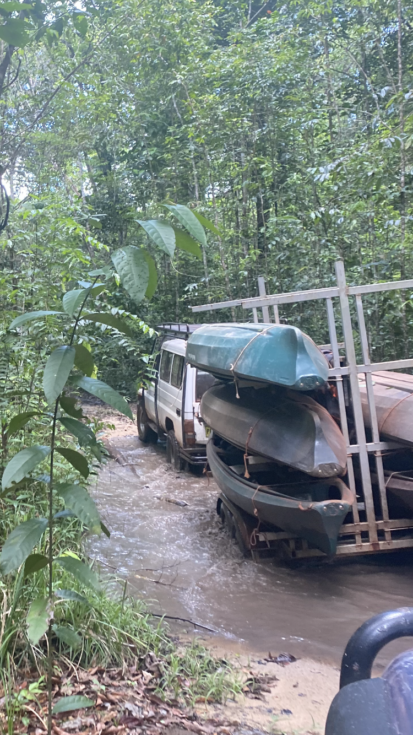 De tocht begint met een ruige jeep rit door witte savannes en modderige kuilen. Achter ons bungelen kajaks op een trailer. Zodra we de rivier bereiken, begint een nieuw avontuur.