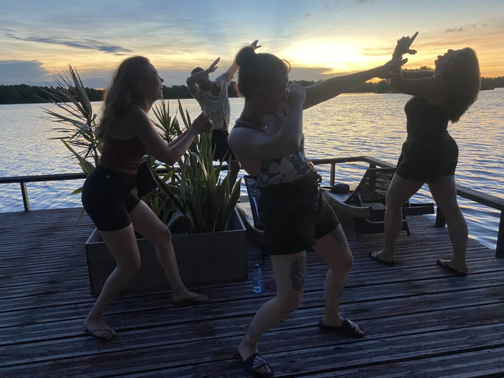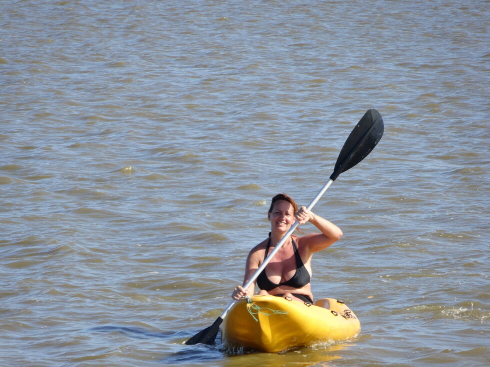 Twee dagen lang peddelen we midden in de wildernis. De zon brandt, vogels vliegen over, soms duikt een otter op. Halverwege slaan we kamp op aan de oever: een groot zeil als dak, hangmatten met klamboes, een vuurplaats in het zand. De begeleider kookt het diner, terwijl het kamp zich vult met geuren, gesprekken en gelach. Wie durft, neemt een bad in de rivier.